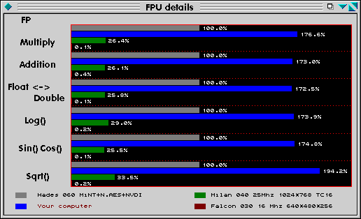 | Float multiply (64bit) | 35.617 MegaFlops (~13440%) |