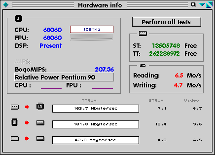 | Linear 32bit write (ST-Ram) | 13.133 MByte/sec (~203%) |