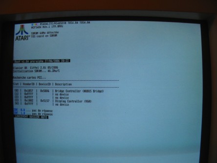 3 Juin 2006. Le TOS fonctionne jusqu'au démarrage du GEM, la CompactFlash est détectée mais l'écriture dans ses registres ne fonctionne pas, le bios PCI fonctionne en configuration,