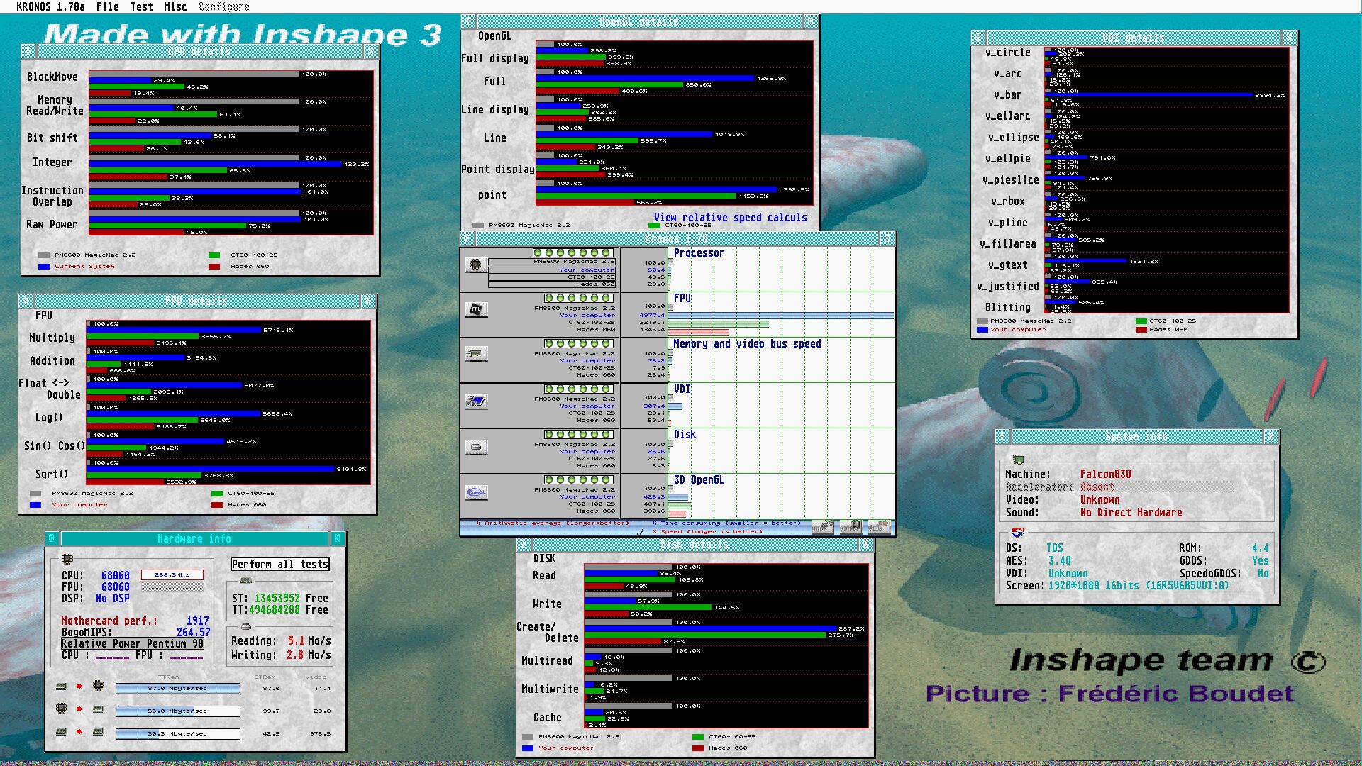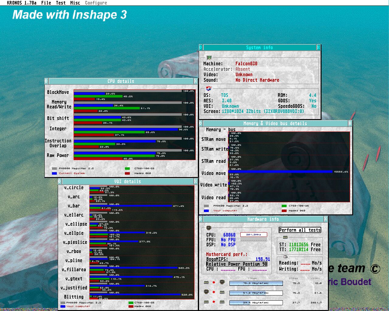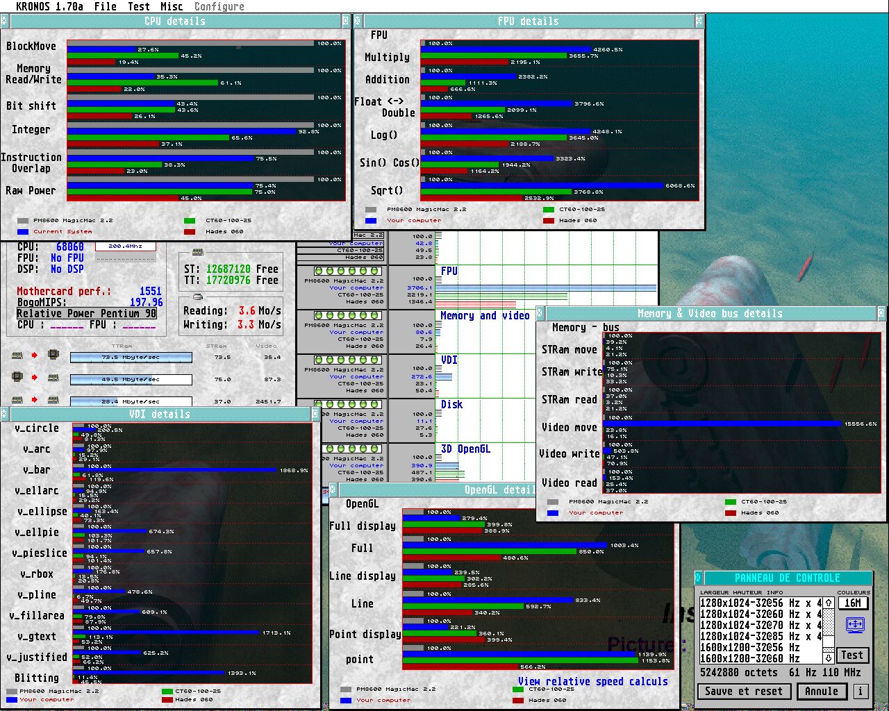 10 Septembre 2006. Passage du ram-disque à 8 Mo. Réecriture des fonctions textes de fVDI en instructions Coldfire. Modification du TOS pour qu'il fonctionne en 16M de couleurs, les icônes couleurs sont affichés en monochrome. CT60CONF.CPX permet de sélectionner les modes vidéo en 256 / 65K / 16M de couleurs pour le boot et/ou le fichier NEWDESK.INF. Kronos et Vdibench donnent de bon résultats pour les textes en 1280 x 1024 x 16M couleurs.